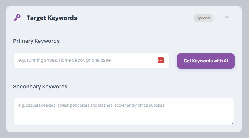 This section includes two fields: Primary Keywords and Secondary Keywords. You can enter keywords in both to help the AI focus on SEO optimization—especially when the “SEO Keywords” option is selected in the Content Priorities section.